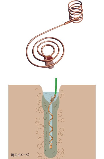 中心部に打込み工具を差込み、打ち込んでいくとスパイラル状となって地中に設置されます。更に打込み工具を引抜いた穴に接地抵抗低減剤を注入すると、スパットアースの周囲に広く浸透・滞留・硬化し、接地抵抗値を効果的に低減させることができます。